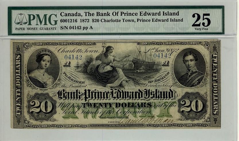 The Bank of Price Edward Island, 1872 $20 #04142, CH-600-12-16, PMG VF25. Only one example finer.