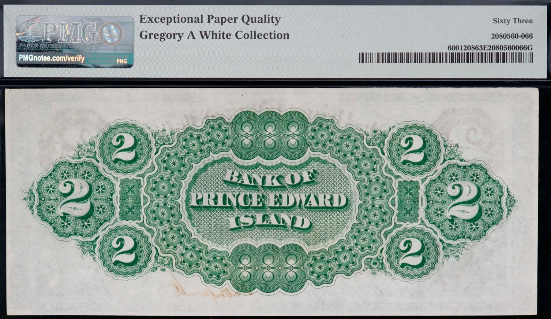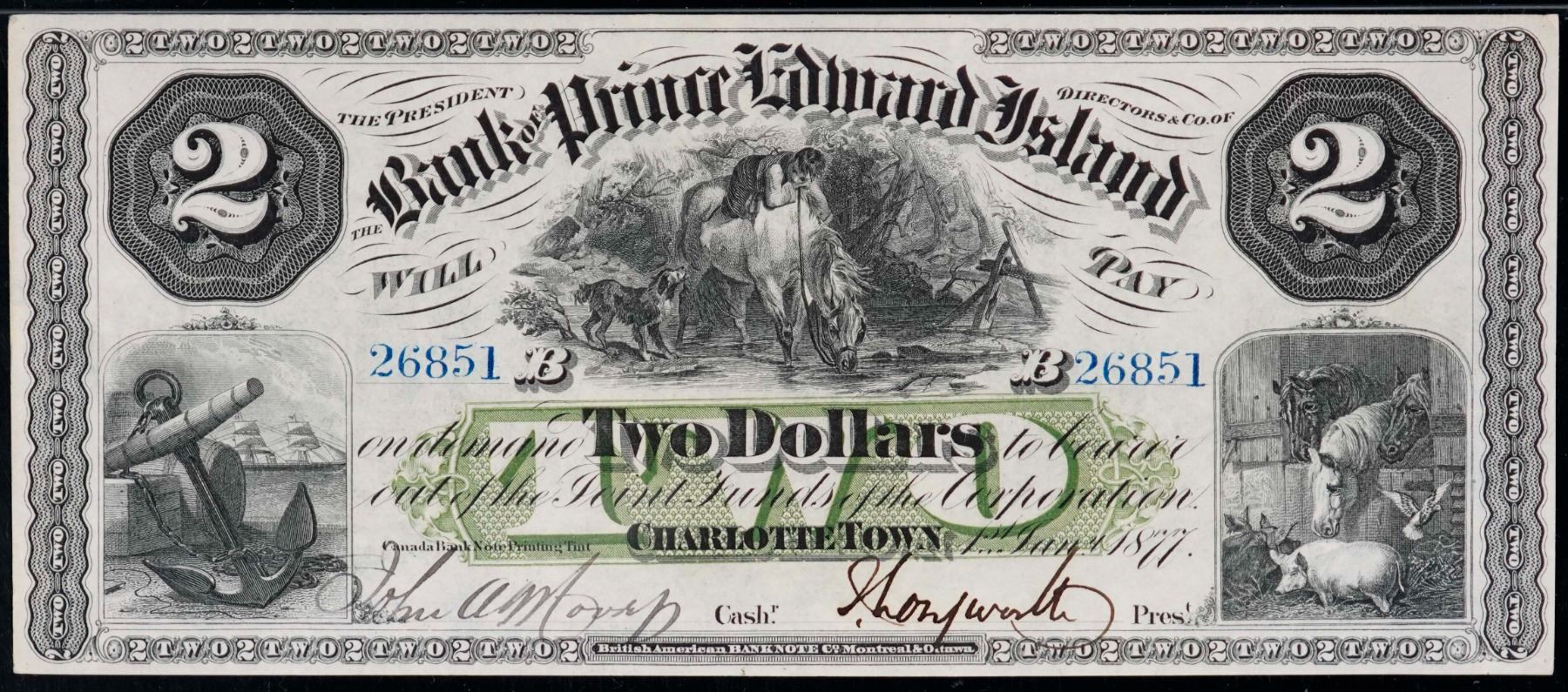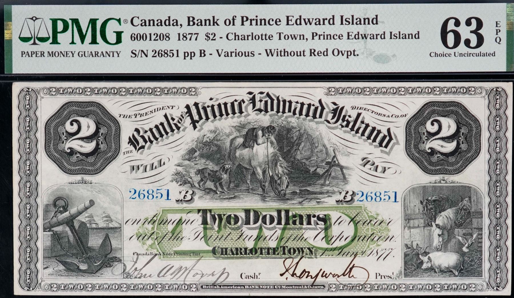 The Bank of Prince Edward Island; 1877 $2 #26851 CH-600-12-08, PMG Choice Uncirculated-63EPQ. Great eye appeal, great margins and superb embossing.