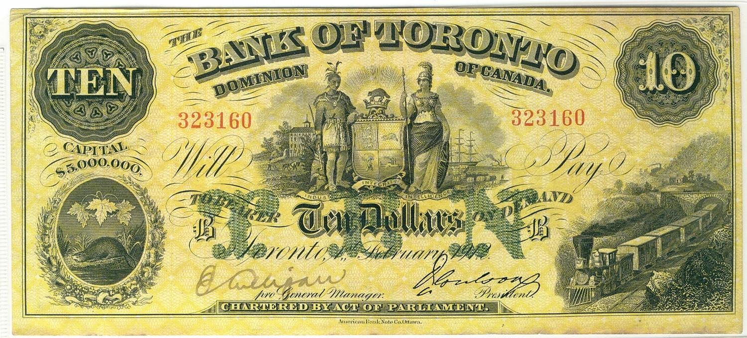 The Bank of Toronto 1912 $10 #323160 CH-715-22-32. A sharp VF/EF issue with light staining on back. Should be viewed.