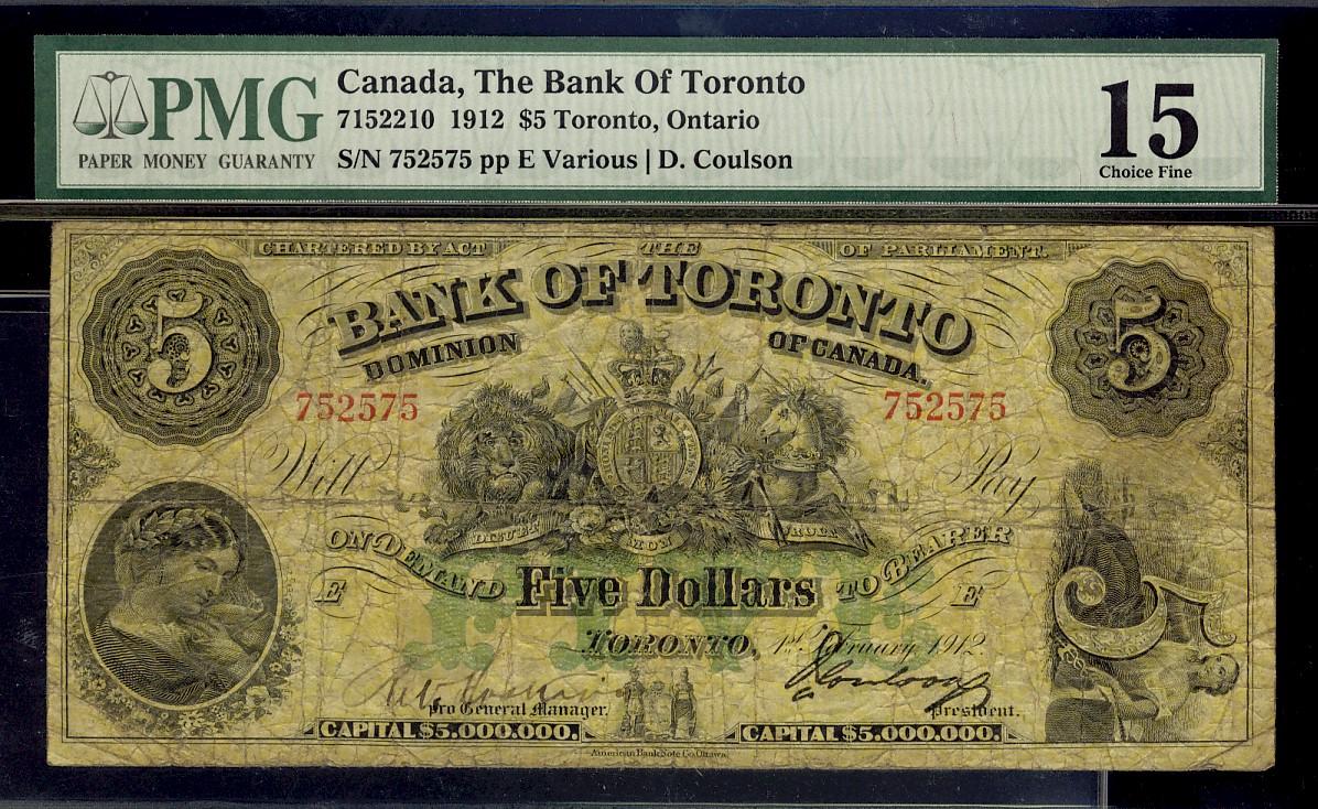 The Bank of Toronto 1912 $5 #752575 CH-715-22-10 PMG CH F15. Only 15 known.
