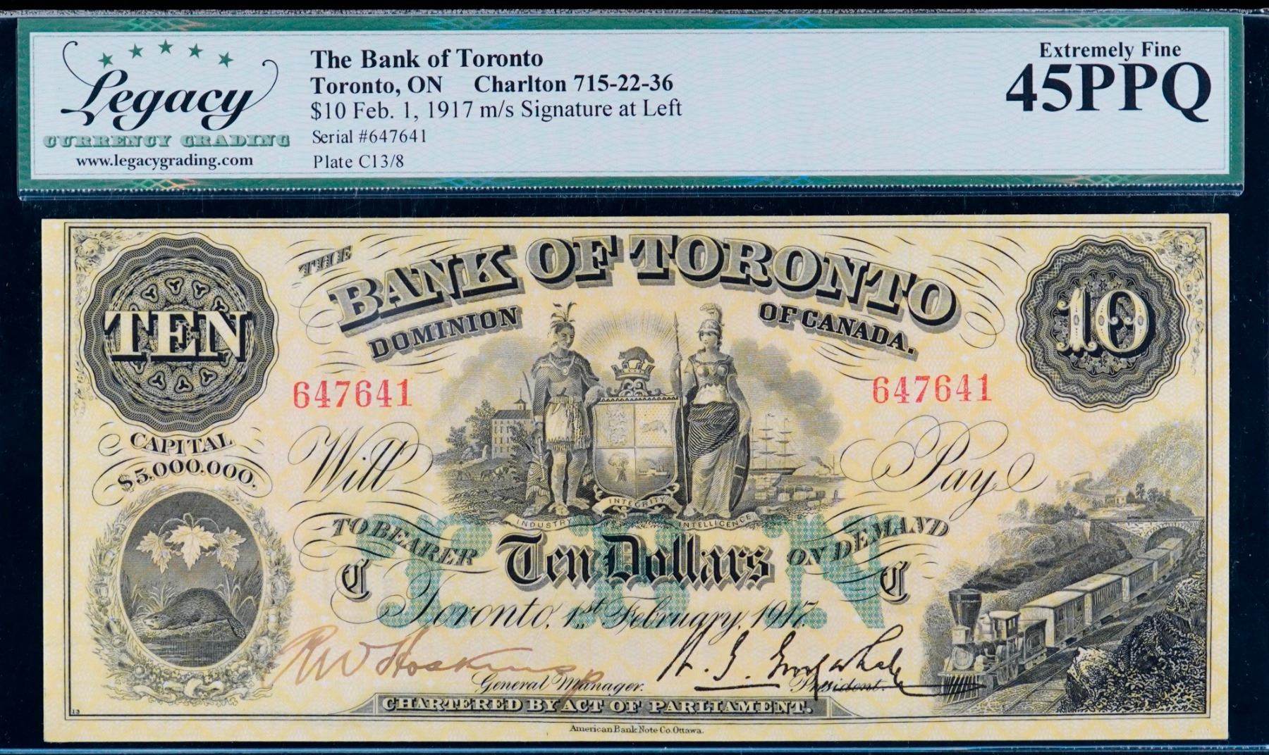 The Bank of Toronto; 1917 $10 #647641 CH-715-22-36, LCG Choice Extra Fine-45PPQ.Overall bright and appealing example.