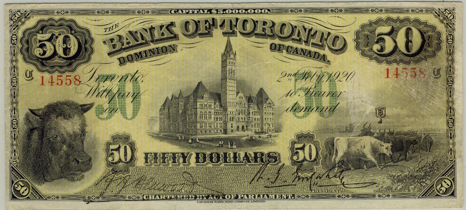 The Bank of Toronto 1920 $50 #14558 CH-715-22-76 PMG VF20. RARE. This is only the second example seen and ever handled by TCNC. Worth a premium bid.