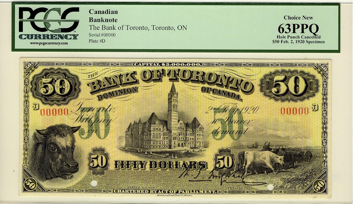 The Bank of Toronto, 1920 $50 Specimen Issue, PCGS CH UNC63PPQ.