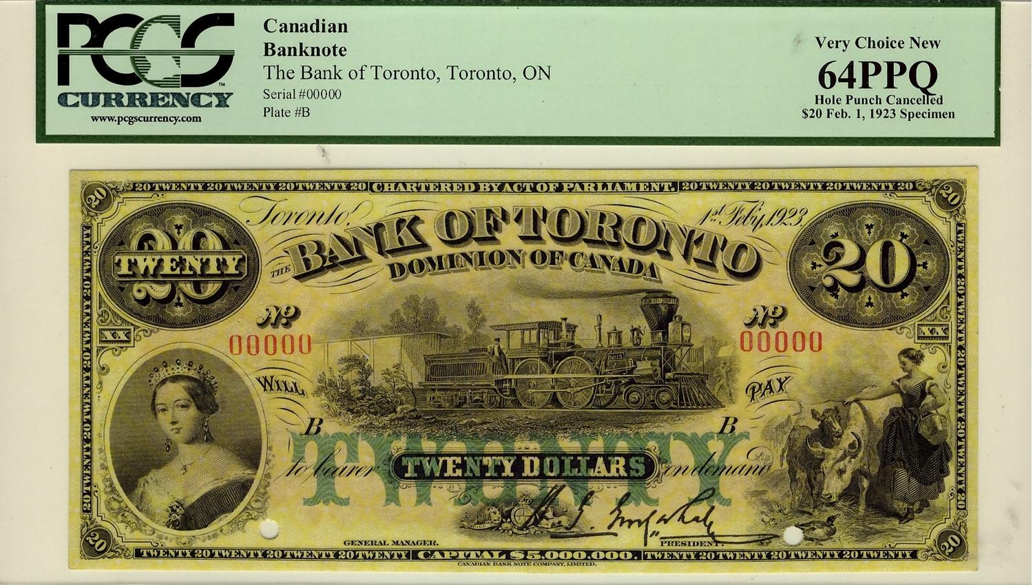 The Bank of Toronto, 1923 $20 Specimen Issue, PCGS CH UNC64PPQ.