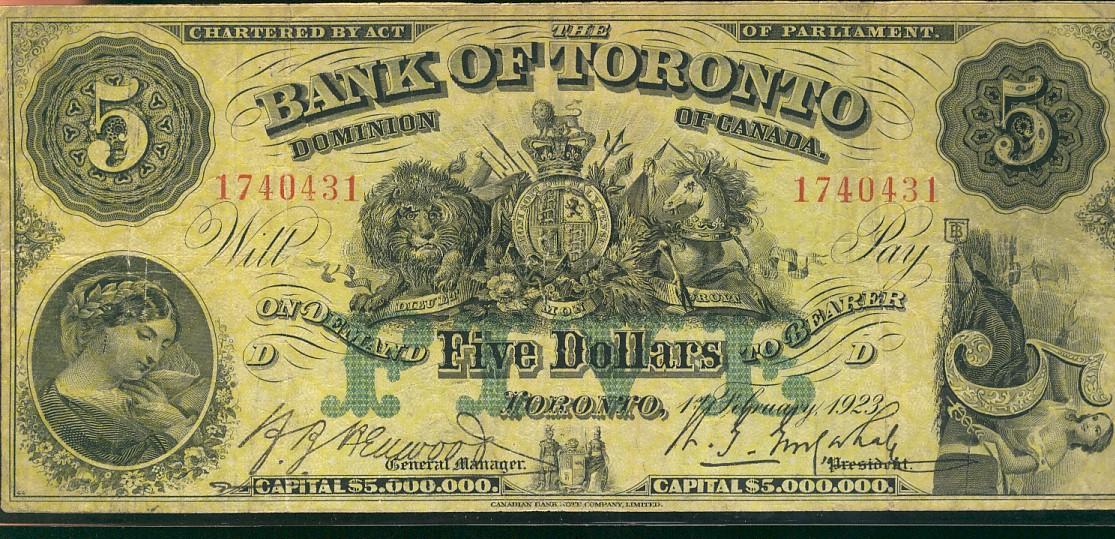 The Bank of Toronto 1923 $5 #1740431 CH-715-22-20. Fine to VF in grade.