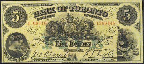 The Bank of Toronto 1923 $5 No.1366446 CH715-22-18 about EF. A very nice and bright note.