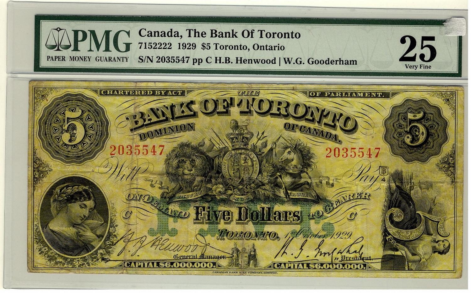 The Bank of Toronto, 1929 $5 #2035547, CH-715-22-22, PMG VF25.