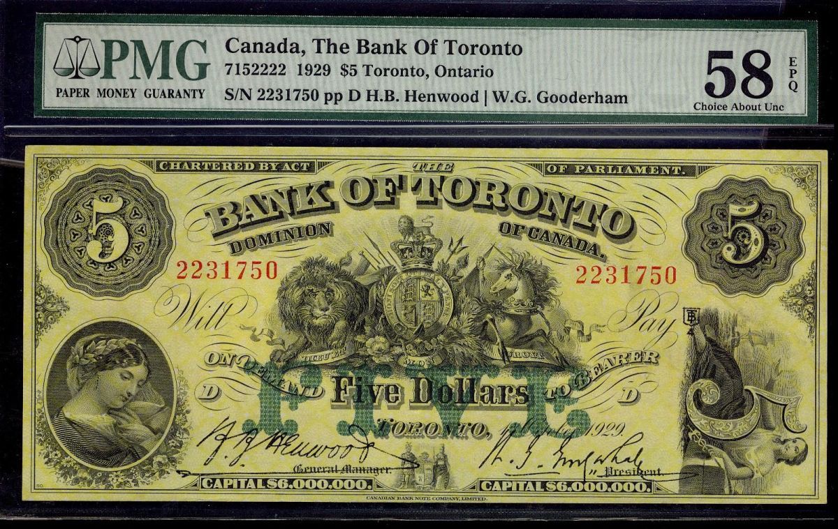 The Bank of Toronto 1929 $5 #2231750 CH-715-22-22 PMG AU58.