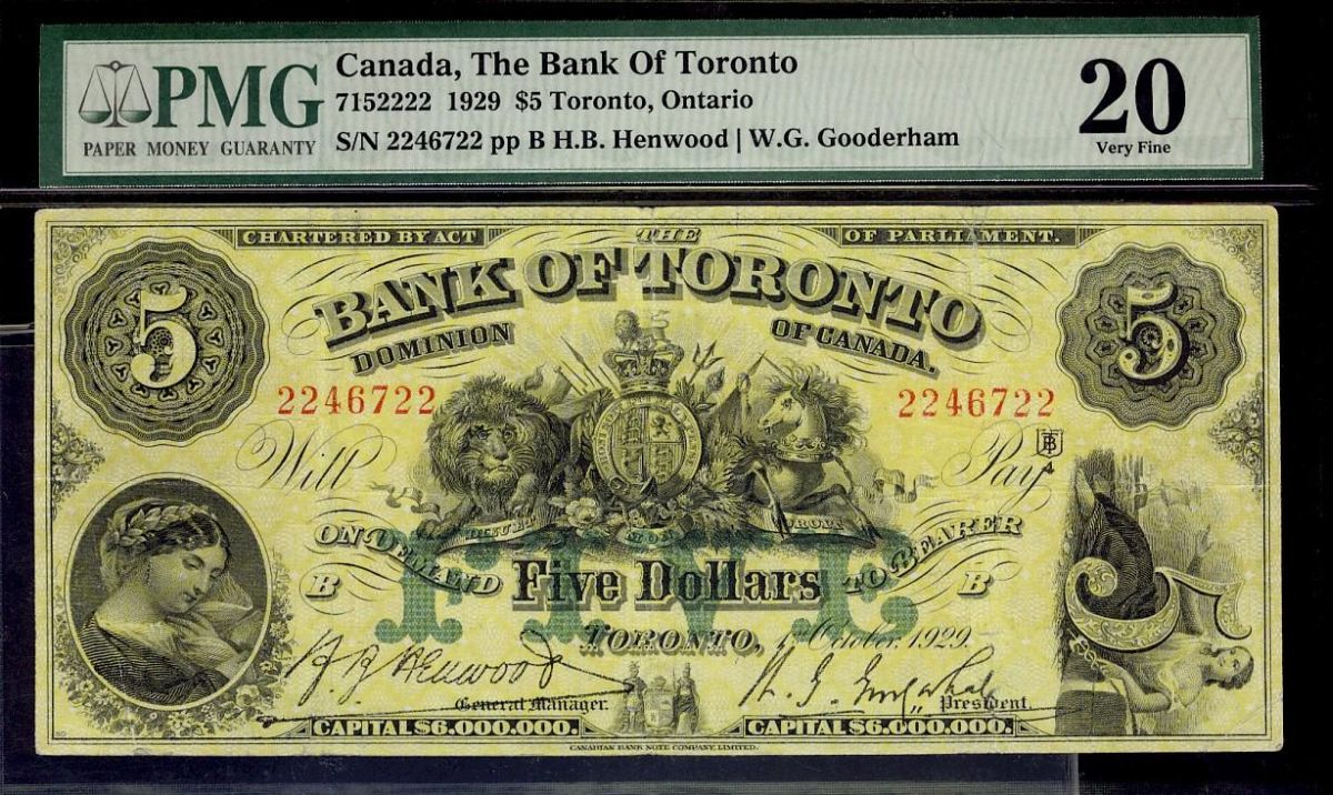 The Bank of Toronto 1929 $5 #2246722 CH-715-22-22 PMG VF20.