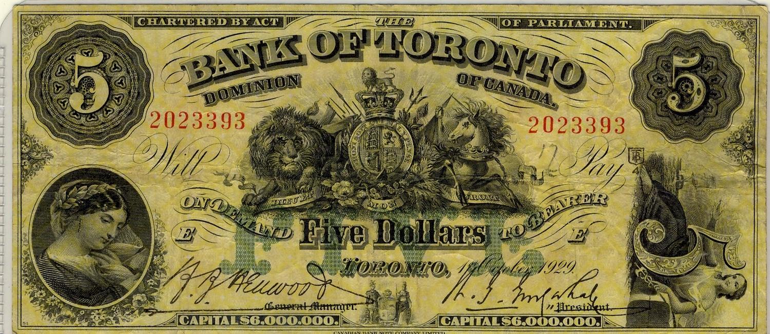 The Bank of Toronto 1929 $5 CH-715-22-22 #2023393. F/VF