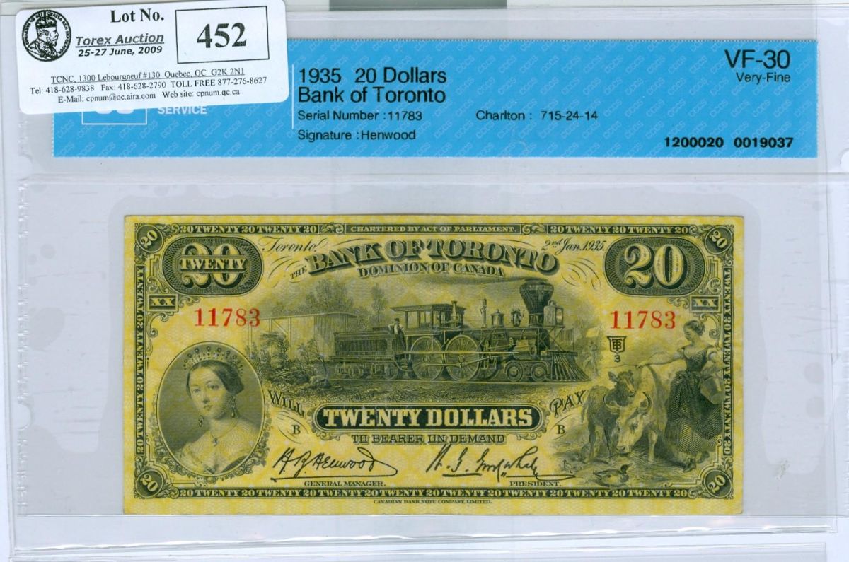 The Bank of Toronto 1935 $20 #11783 CH-715-24-14 CCCS VF30. Lovely and popular 'Train' vignette.