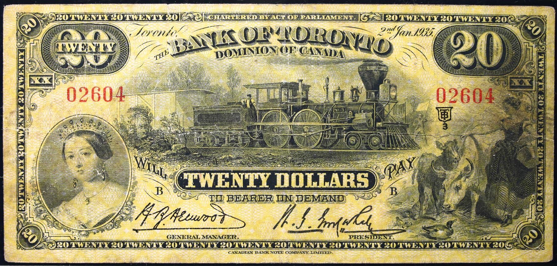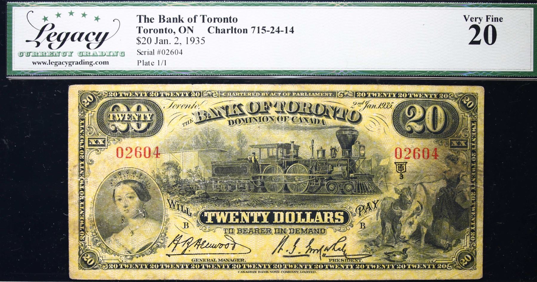 The Bank of Toronto 1935 $20 CH-715-24-14 #02604 LCG Very Fine-20. Attractive vignette.