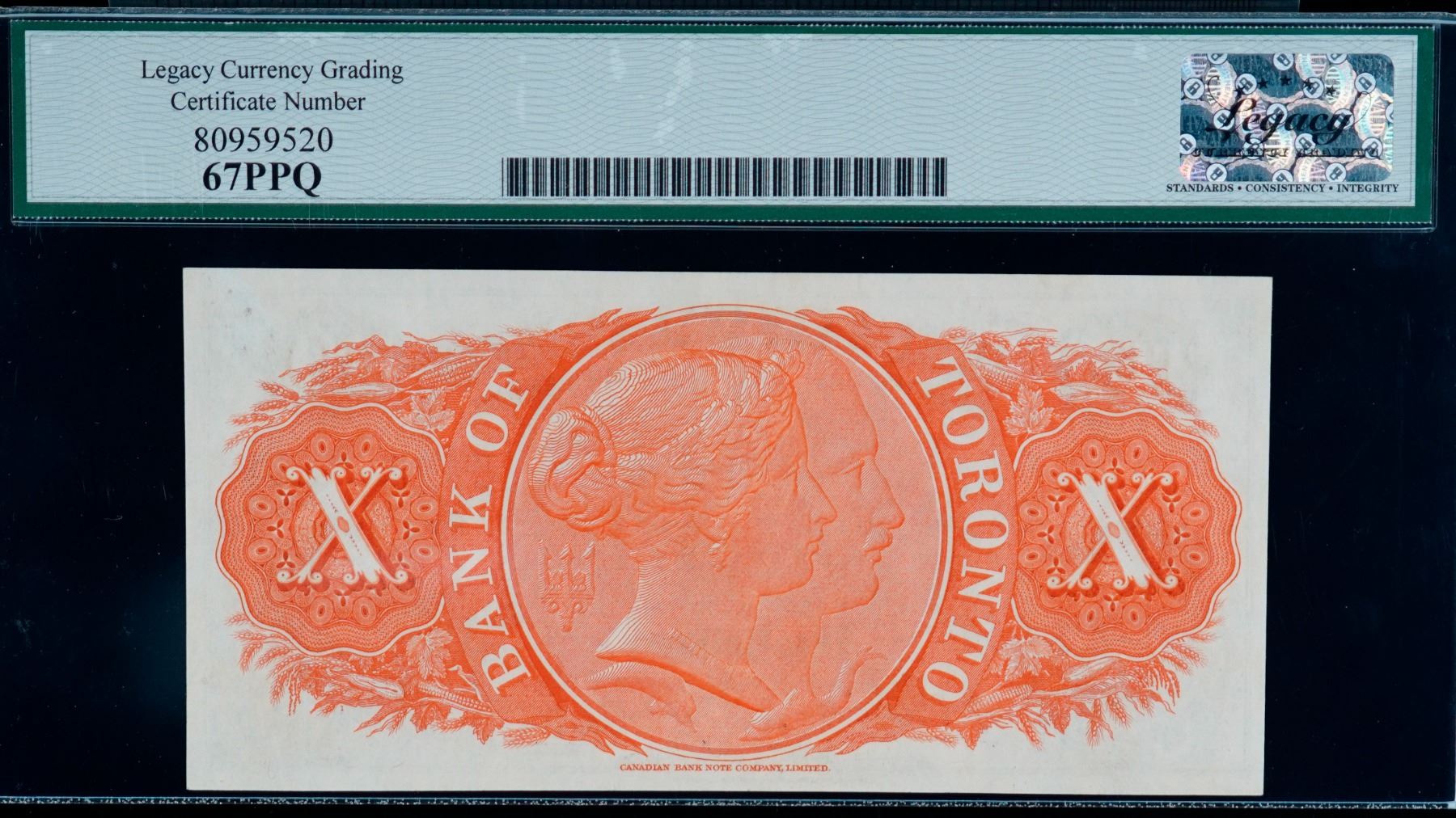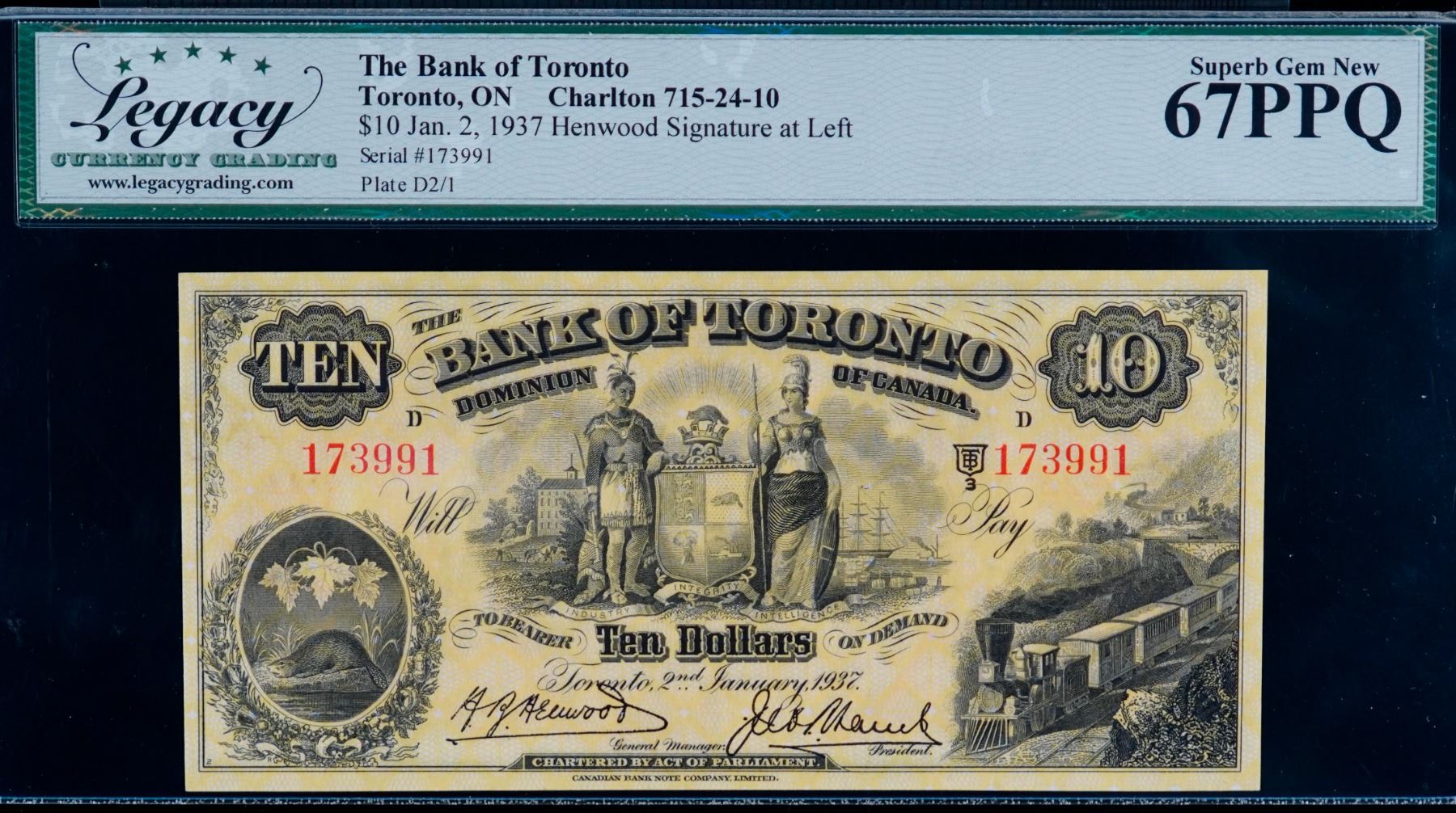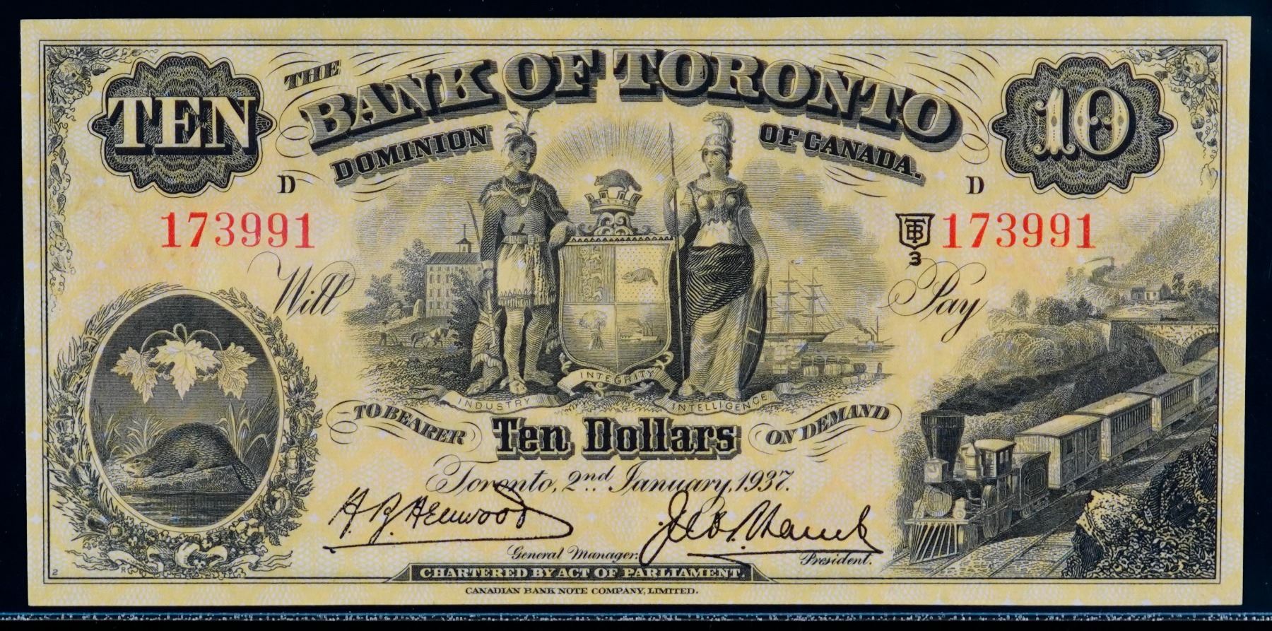 The Bank of Toronto 1937 $10 #173991 CH-715-24-10 LCG Superb Gem Uncirculated-67PPQ. This is a pristine issue with great eye appeal, good margins and superb embossing. Believed to be the finest graded example.