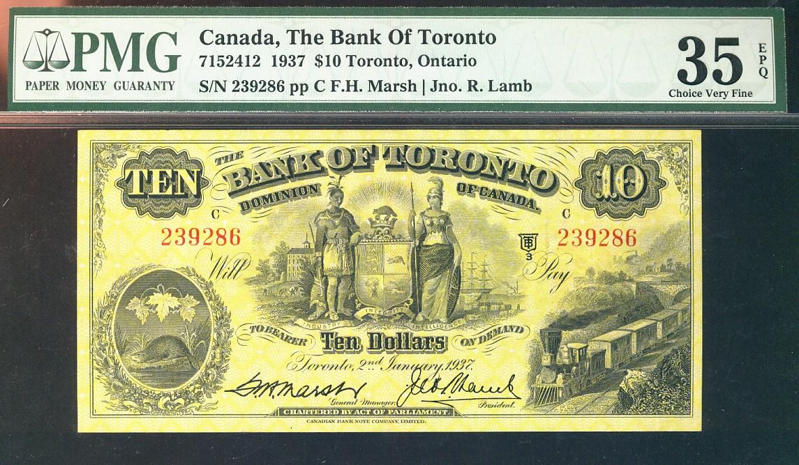 The Bank of Toronto, 1937 $10 #239286, CH-715-24-12, PMG VF35EPQ. Very nice example, looks better.