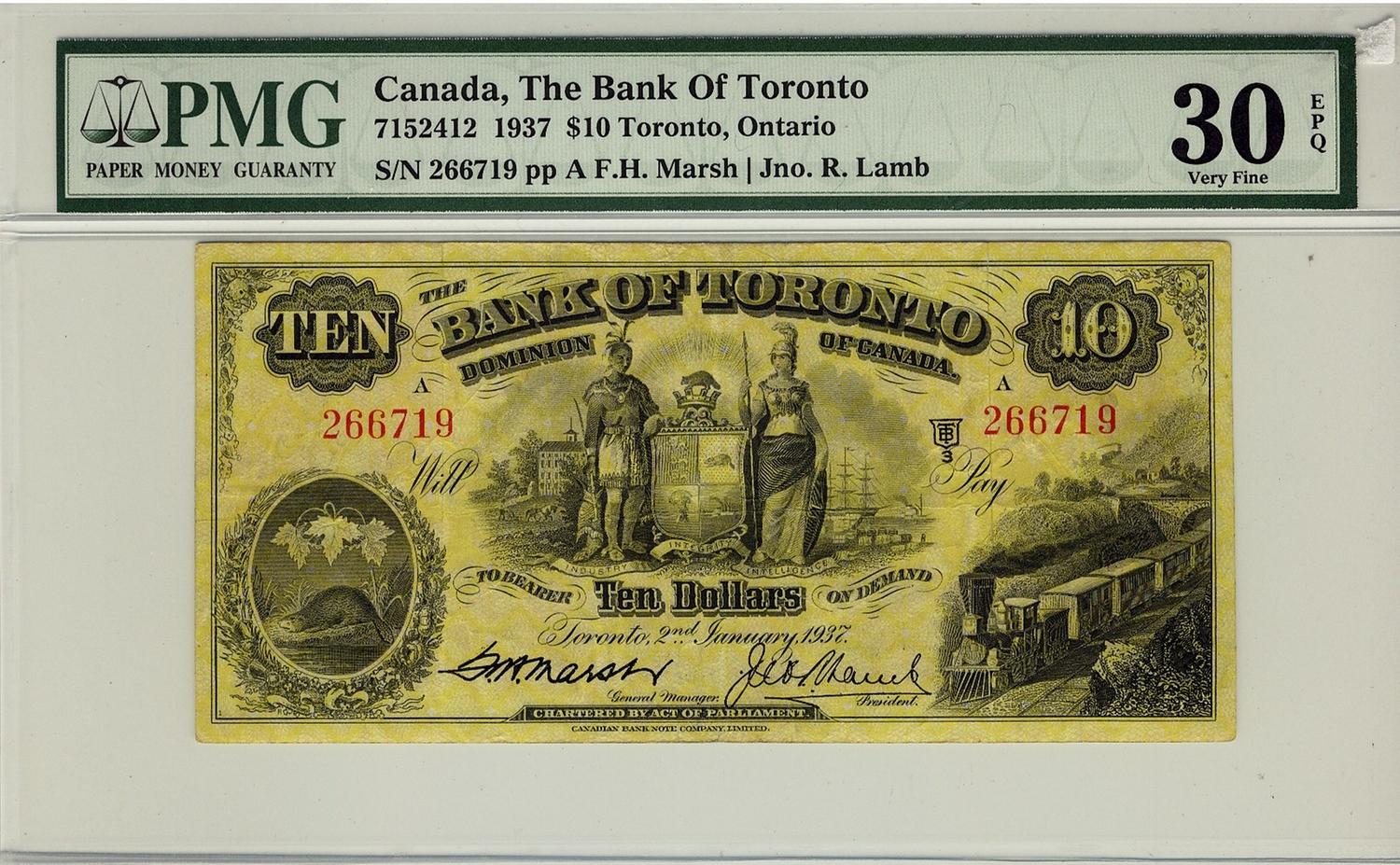The Bank of Toronto, 1937 $10 #266719, CH-71524-12, PMG VF30EPQ.