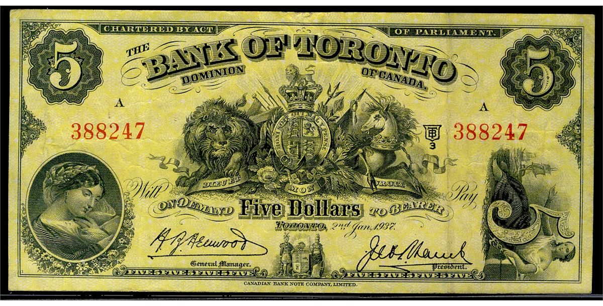The Bank of Toronto; 1937 $5 #388247 CH-715-24-10. Henwood signature. A solid VF.
