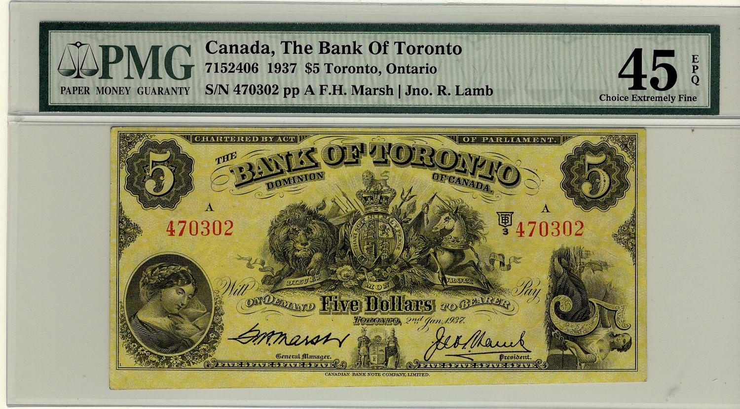The Bank of Toronto, 1937 $5 #470302, CH-715-24-06, PMG EF45 EPQ,