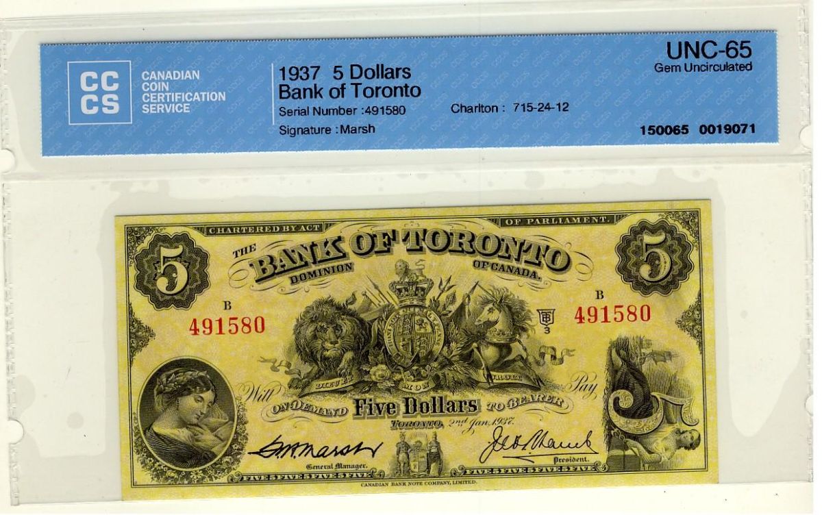 The Bank of Toronto 1937 $5 #491580 CH-715-24-06, CCCS UNC-65. Holder mis-attributed.