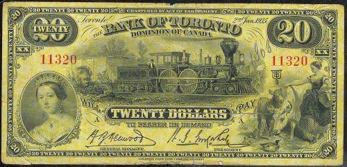 The Bank of Toronto, $20 1935 CH-715-24-14, No. 11320 F+, attractive "Train" note! Very popular and usually sells well over book price. Small writing on face and a horizontal tear. An affordable example.