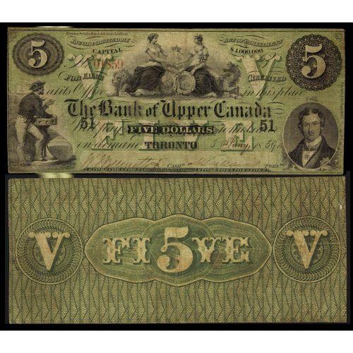 The Bank of Upper Canada 1859 $5 CH-770-22-02-08 CCGS F-12 pinholes, nicks.Ser.# 01859; 51 overprinted in black. Engraved date 5 July 1859 Bennetts -Scollard. No notes that are privately owned are known to the cataloguer or the auction house. Of the highest rarity. A museum piece. Expect stong bidding
