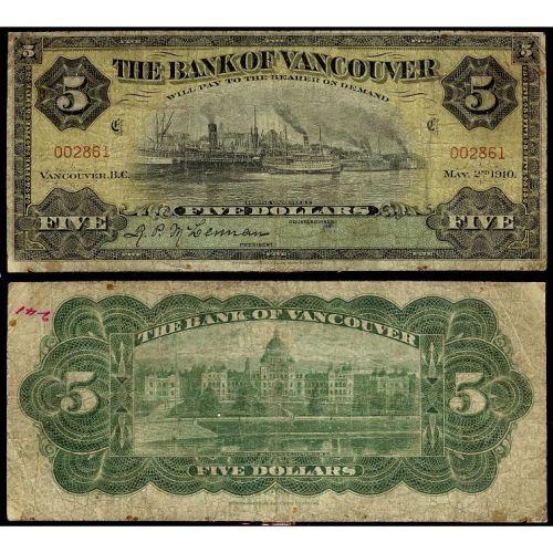 The Bank of Vancouver $5 1910 CH-775-10-02 "Uncancelled" ser.#002861 CCGS graded VG-8. An excessively rare issued type note of this very rare Bank. First one handled by TCNC. Worth a premium bid. Highest of rarity!