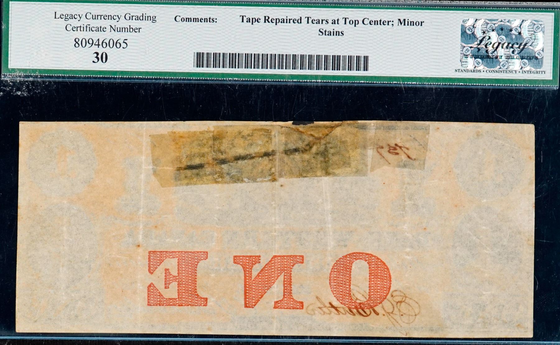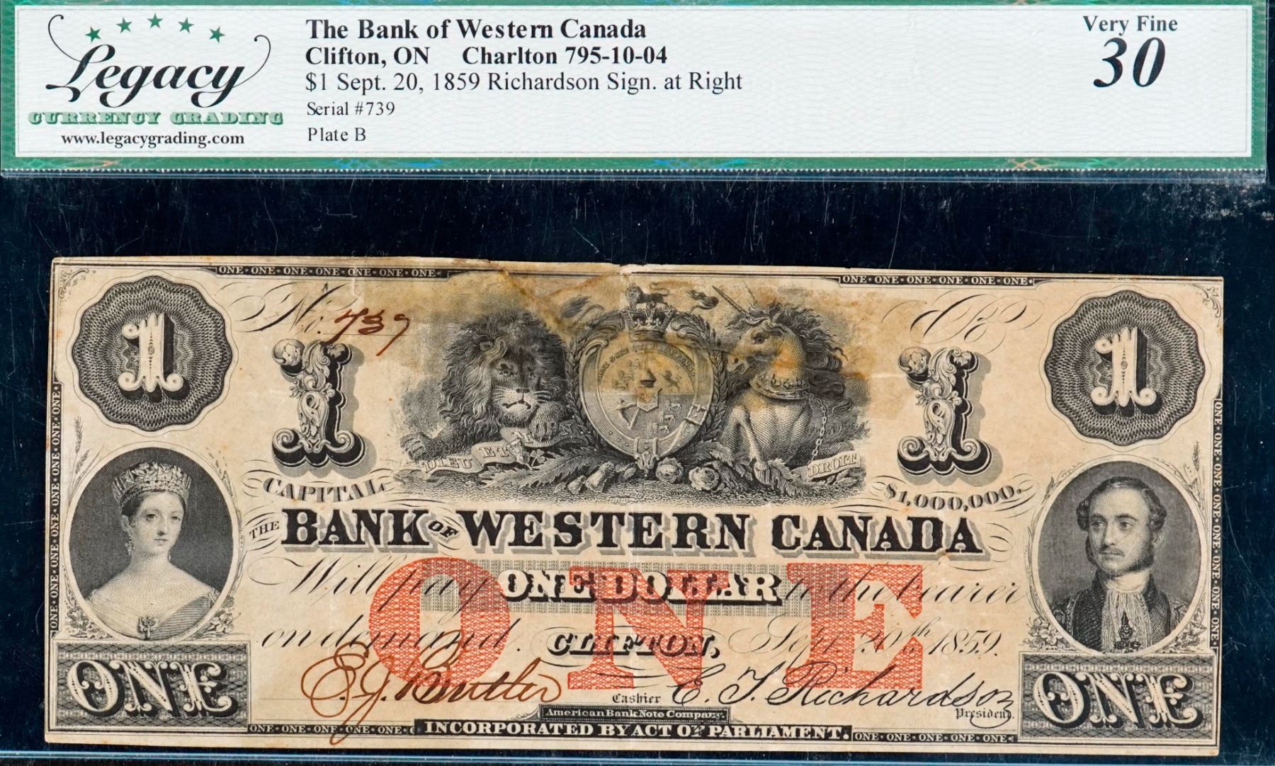 The Bank of Western Canada; 1859 $1 #739 CH-795-10-04, Legacy Currency Grading Choice Very Fine-30 w/comments Tears / stains and repairs.