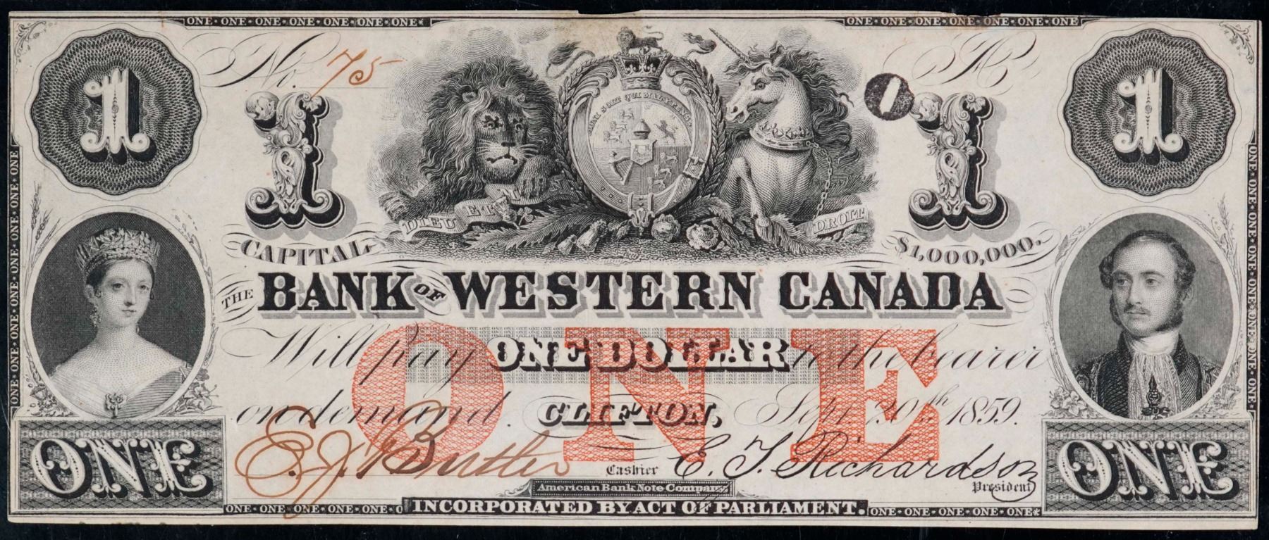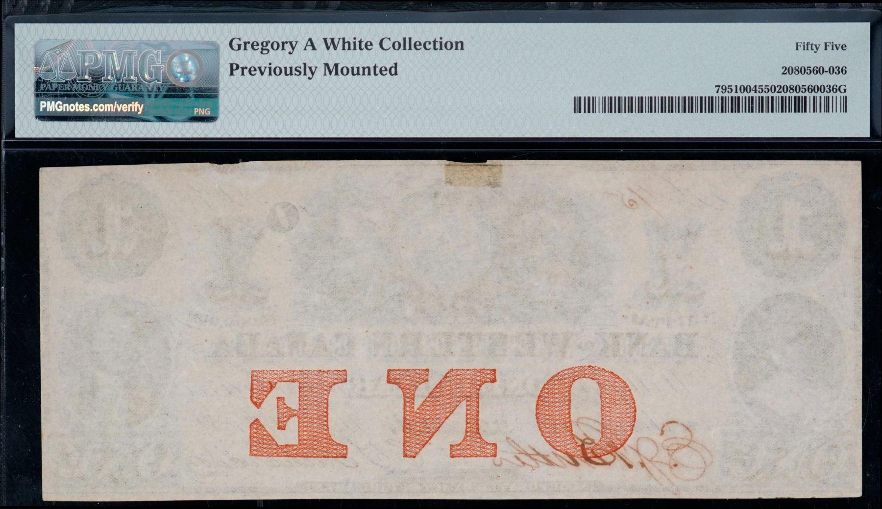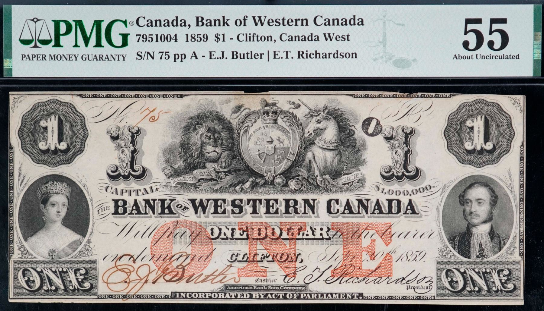 The Bank of Western Canada; 1859 $1 #75 CH-795-10-04. PMG Choice About Uncirculated-55. Low Serial Number, from the Gregory A. White Collection - Previously Mounted.