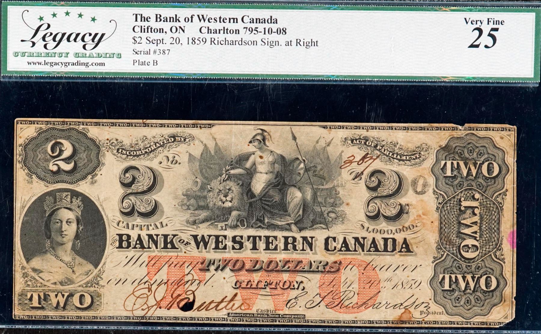 The Bank of Western Canada; 1859 $2 #387 CH-795-10-08, Legacy Currency Grading Choice Very Fine-25 w/comments.