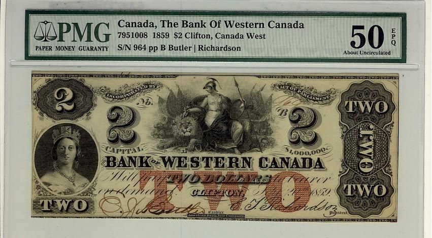 The Bank of Western Canada, 1859 $2 #964, CH-795-10-08, PMG AU50 EPQ. Only 2 examples finer. Scarce and underrated.