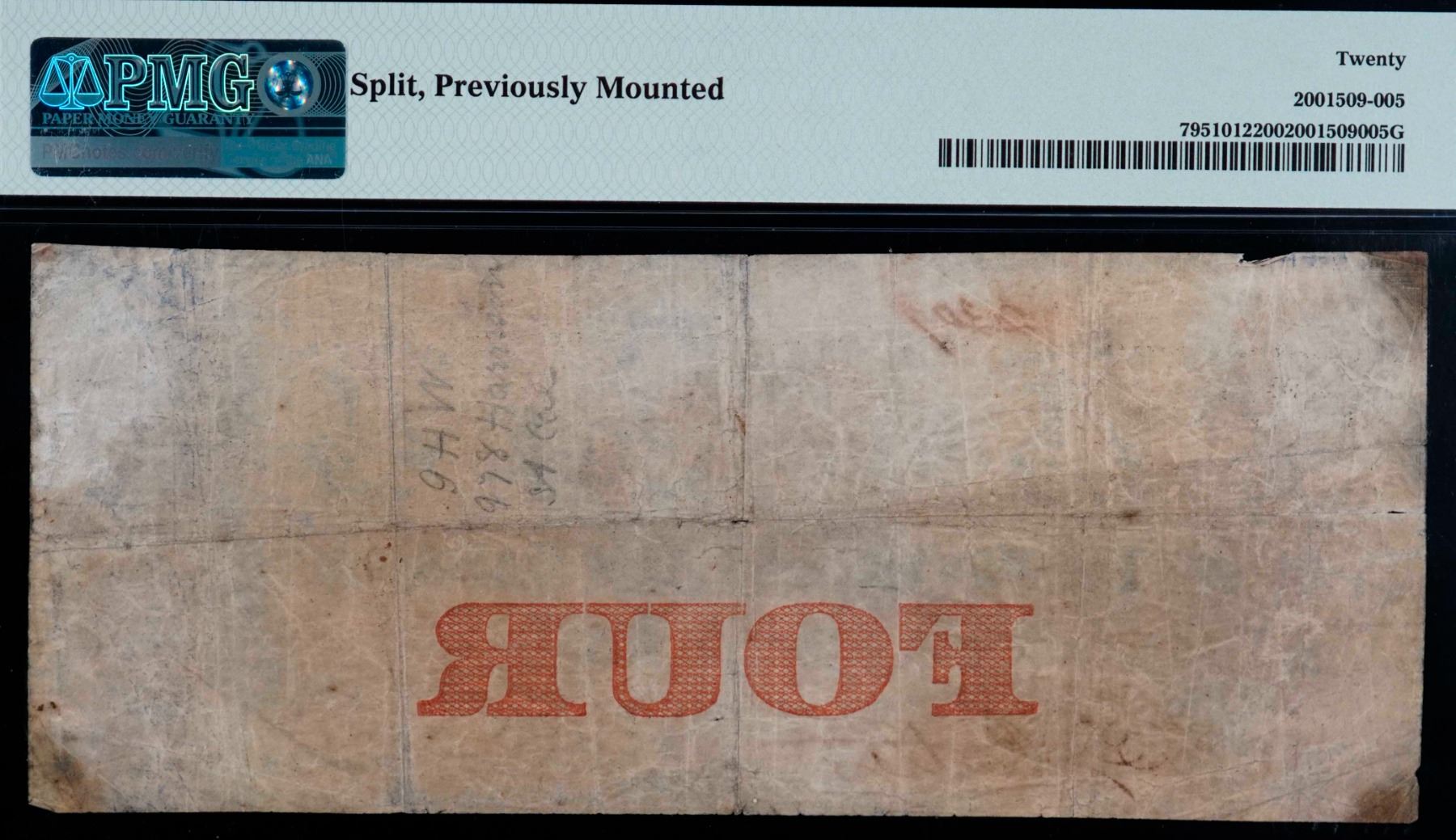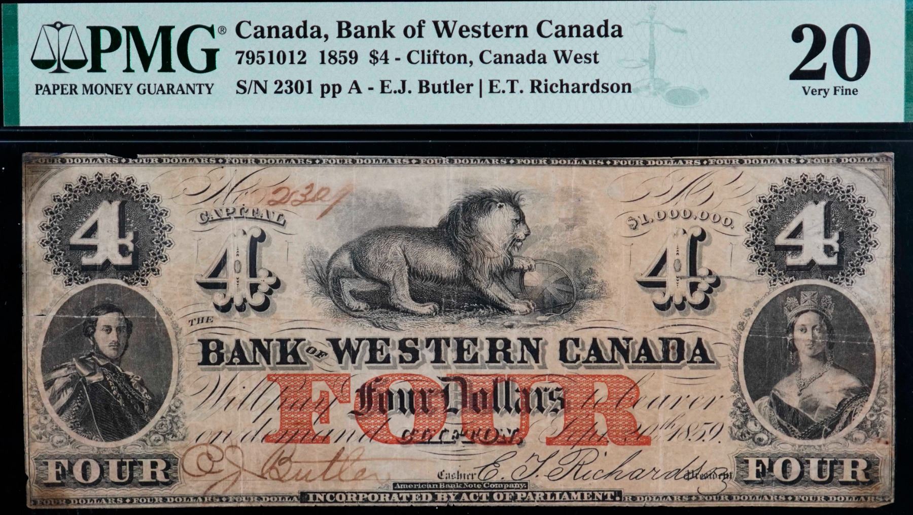 The Bank of Western Canada; 1859 $4 #2301 CH-795-10-12, PMG Very Fine-20. Split, previously mounted.