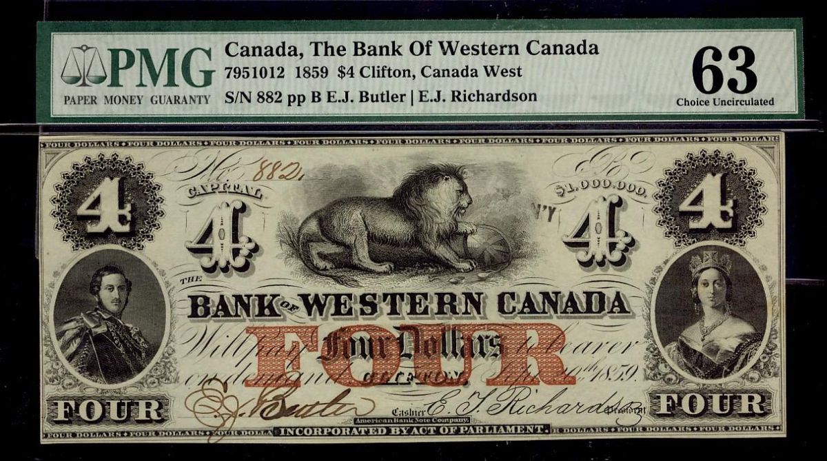The Bank of Western Canada 1859 $4 #882 CH-795-10-12 PMG CH UNC63.