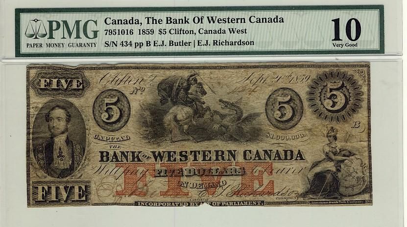 The Bank of Western Canada, 1859 $5 #434 RADAR NOTE, CH-795-10-16, PMG VG10. Underrated.