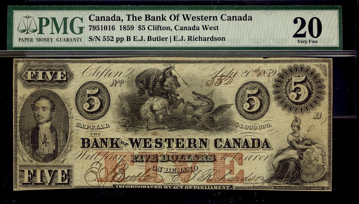 The Bank of Western Canada 1859 $5 #552 CH-795-10-16 PMG VF20.