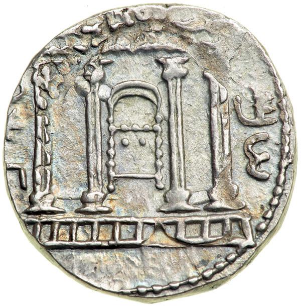 The Bar Kokhba War, 132-135 CE. AR Tetradrachm (or Sela; 14.26 g) attributed to year 3 (134-135 CE). Tetrastyle façade of the Temple of Jerusalem; within the middle of the Temple interior, the Ark of the Covenant in chest form; above, rosette; around, Palaeo-Hebrew inscription "Shim'on". Reverse: Lulav thrice bound; to left, etrog; around, Palaeo-Hebrew inscription "For the Freedom of Jerusalem". Mild 79 [95 examples cited]; H-1411. Choice Very Fine. .
