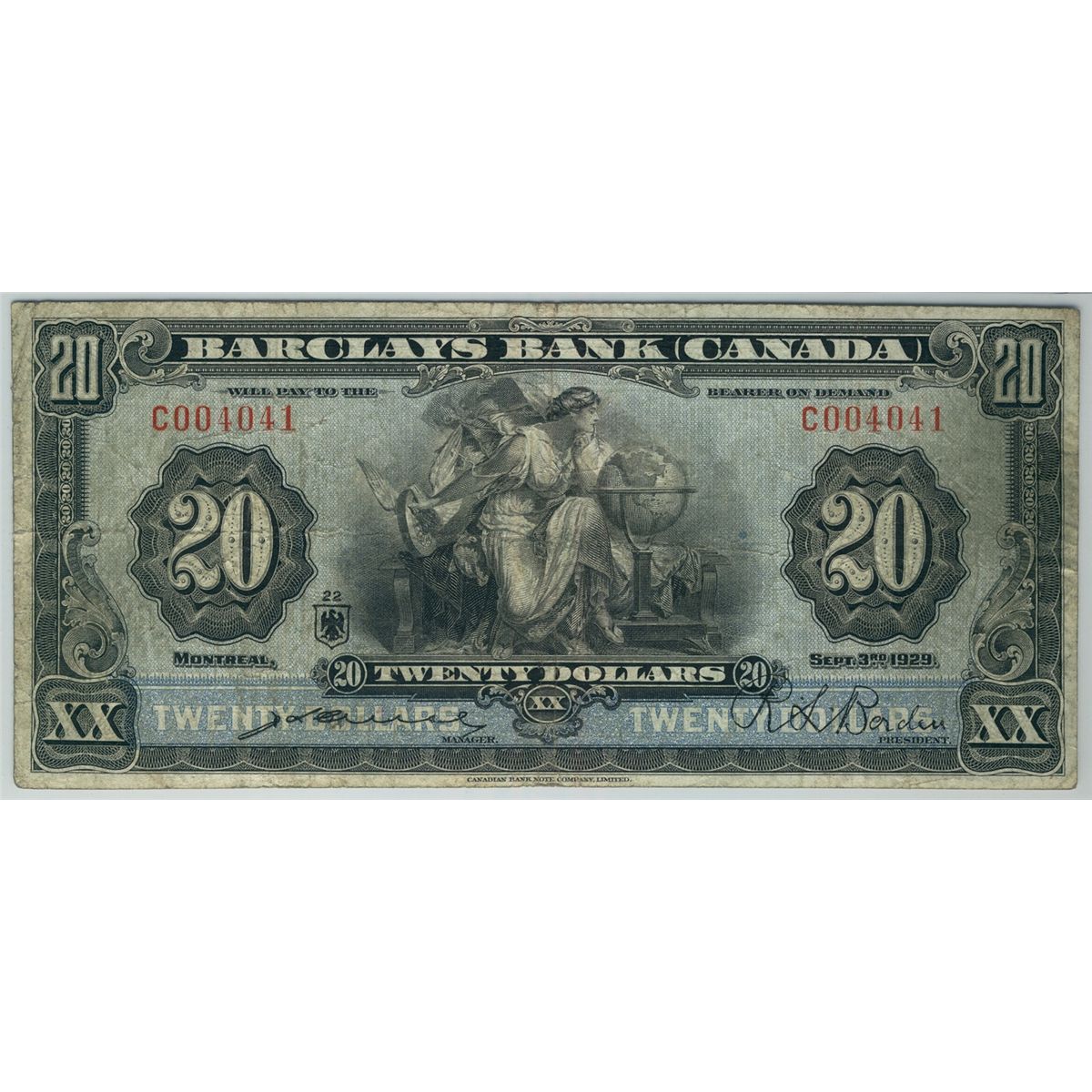 The Barclays Bank 1929 $20 #C004041 CH-30-10-06 PMG F15, Excessively scarce and rarely offered. Only 10 examples known. The second best example graded by PMG.