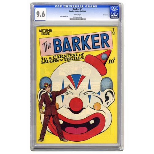 <B>The Barker #1 Vancouver pedigree (Quality, 1946) CGC NM+ 9.6 White pages.</B></I> Another Vancouver book, another high-grade stunner! If you'd never heard of the Barker, he is indeed a carnival barker, and his travels around the country with the carnival result in all kinds of adventures. Quality thought so highly of the character that he was the lead feature in <B>National Comics</B></I> for quite a while as well. Overstreet 2006 NM- 9.2 value = $250. CGC census 1/06: 1 in 9.6, none higher.