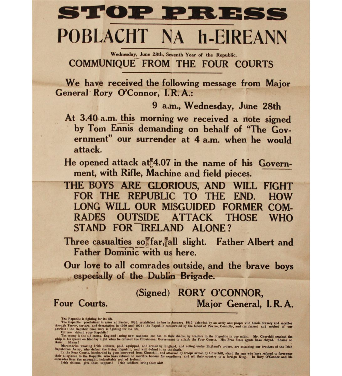 Broadside issued by the IRA announcing the first day of The Irish Civil War. It breaks news of the war's initial military confrontation, the Battle of Dublin on 28 June 1922. After its war for independence from England ended in 1921, Ireland was divided over the Anglo-Irish Treaty resolution between the pro-Treaty Free State forces led by Michael Collins, and the anti-Treaty Republican opposition led by Eamon de Valera of the IRA. Convinced Ireland was still under English rule, the IRA demanded a renegotiation of the Treaty, occupying the Four Courts building in Dublin for powerful effect. On 28 June 1922, Free State forces attempted to quash the rebellion with an attack on the IRA at the Four Courts. A statement by IRA General Rory O'Connor printed at the top is dated Wednesday, 28 June 1922, and reads in huge print: ''...At 3:40 a.m. this morning we received a note signed by Tom Ennis demanding...our surrender at 4 a.m...He opened attack at 4:07...with Rifle, Machine, and field pieces...HOW LONG WILL OUR MISGUIDED FORMER COMRADES OUTSIDE ATTACK THOSE WHO STAND FOR IRELAND ALONE?...'' The highly destructive, week-long Battle of Dublin was won by the Free State forces. Civil War fighting descended into guerrilla warfare throughout the country, with the Free State ultimately emerging victorious over the ill-equipped IRA one year later. Broadside measures 15'' x 20''. Toning and folds, with minor tears and chipping to edges, else near fine.