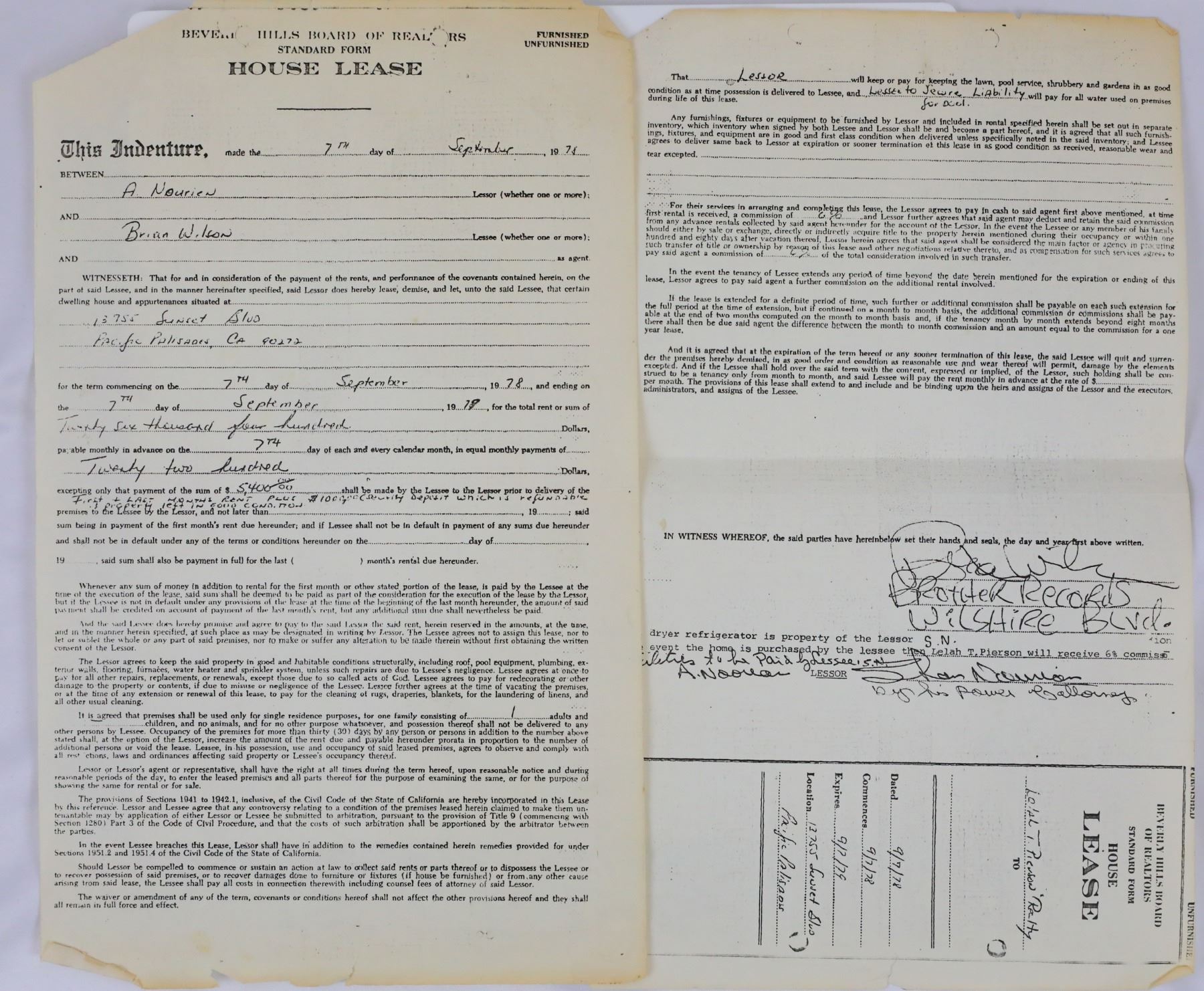 The Beach Boys Original 1970's Copy of Brian Wilson's 1978 House Lease for His Pacific Palisades Home - This is the original 1970's copy of Brian Wilson's home lease. He lived in Pacific Palisades, CA in the 1970's. This document came from the Milton Love estate. Milton Love is the father of one of the most famous Beach Boys, Mike Love (AKA Dr. Love). We will not be showing photographs of the documents to maintain their value as "Unreleased". These items were never meant for release, as the family always assumed that someone had cleaned out the drawers of the dresser prior to selling it. The Beach Boys are one of America's biggest band, and are rock n' roll legends. This is a once in a lifetime opportunity to own a legendary piece of iconic history. We have personally spoken with a representative for The Beach Boys, and they confirmed that this is part of the "Milton Love Lost Collection."