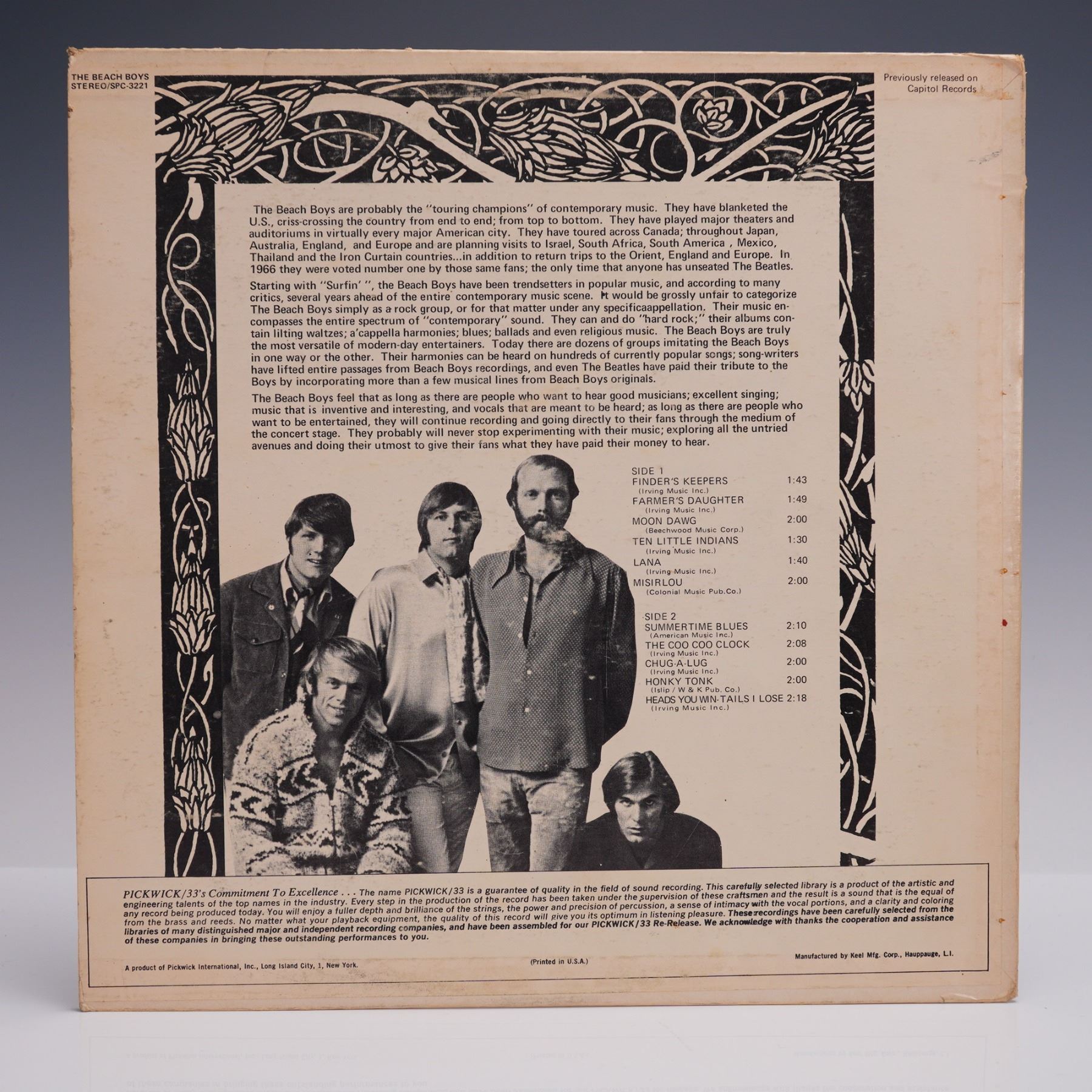 The Beach Boys compilation LP, released by Pickwick International (SPC-3221) in arrangement with Capitol Records. Features early tracks including "Farmer's Daughter," "Moon Dawg," "Summertime Blues," "Ten Little Indians," and "Heads You Win - Tails I Lose." Monochrome silver Pickwick label, with album art showcasing a full-color portrait of the band and stylized floral border design. Vinyl shows light scuffing, visually VG; cover with edge wear and moderate discoloration, overall G+ to VG.