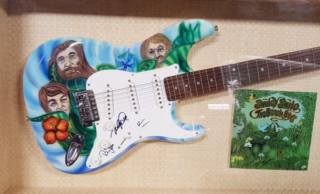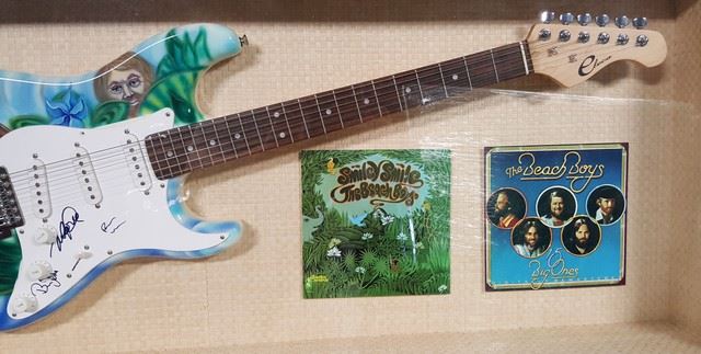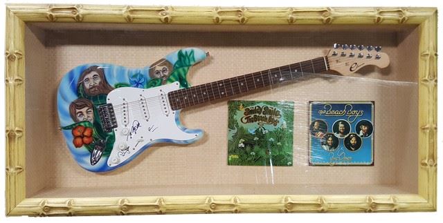 "The Beach Boys" framed and autographed "Eleca" guitar painted with amazingly rich custom artwork. Framed in a very unique bamboo style shadow box wood case with a plexiglass display. COA and hologram included. Measures approximately 23" x 47".