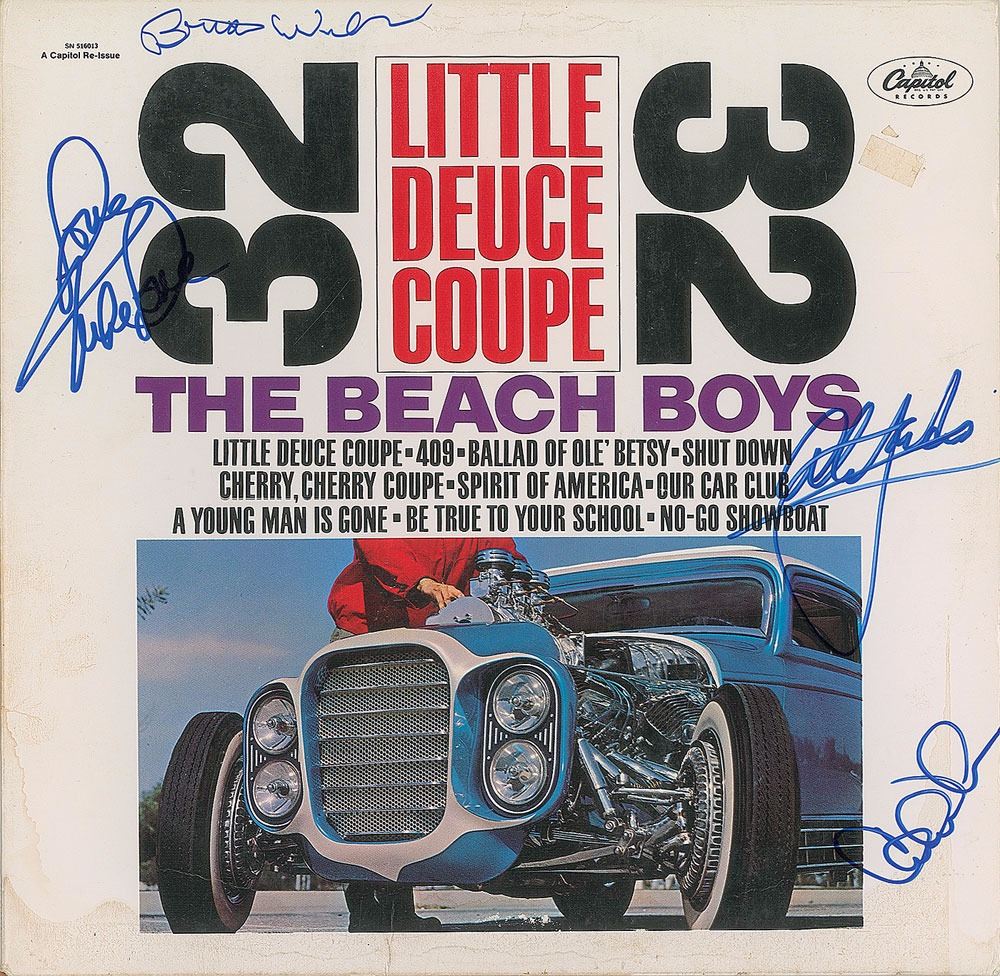 Little Deuce Coupe album signed on the front cover in blue felt tip by Al Jardine, Mike Love, Brian Wilson, and Carl Wilson. In fine condition, with some old price sticker residue, and toning and some water damage to lower portion. The record is not included. Consignor notes that all of the signatures were obtained at the Ritz-Carlton in Cleveland, Ohio, with the Brian Wilson signature dated July 6, 2001, and the other signatures dated August 19 and 20, 1994. Accompanied by photos taken at the time of the Love, Jardine, and Carl Wilson signings.