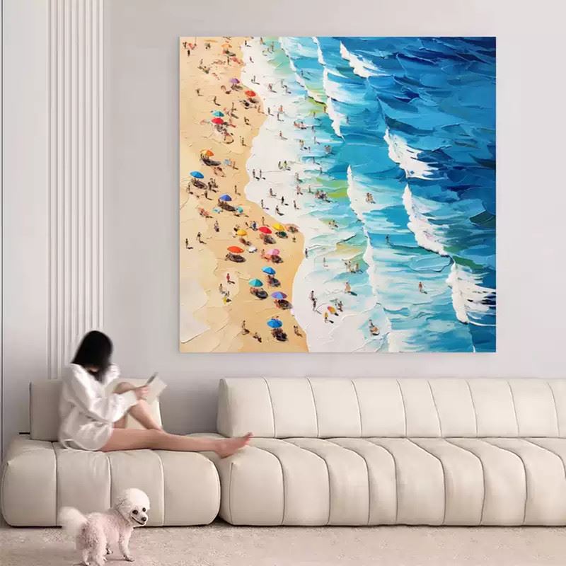 Sunlight spills over the golden shore as waves roll in, with people playing and strolling between sand and sea. Colorful umbrellas dot the beach like scattered candy, filling the scene with the relaxed joy of a holiday. Dimensions: 24 x 24 inches.