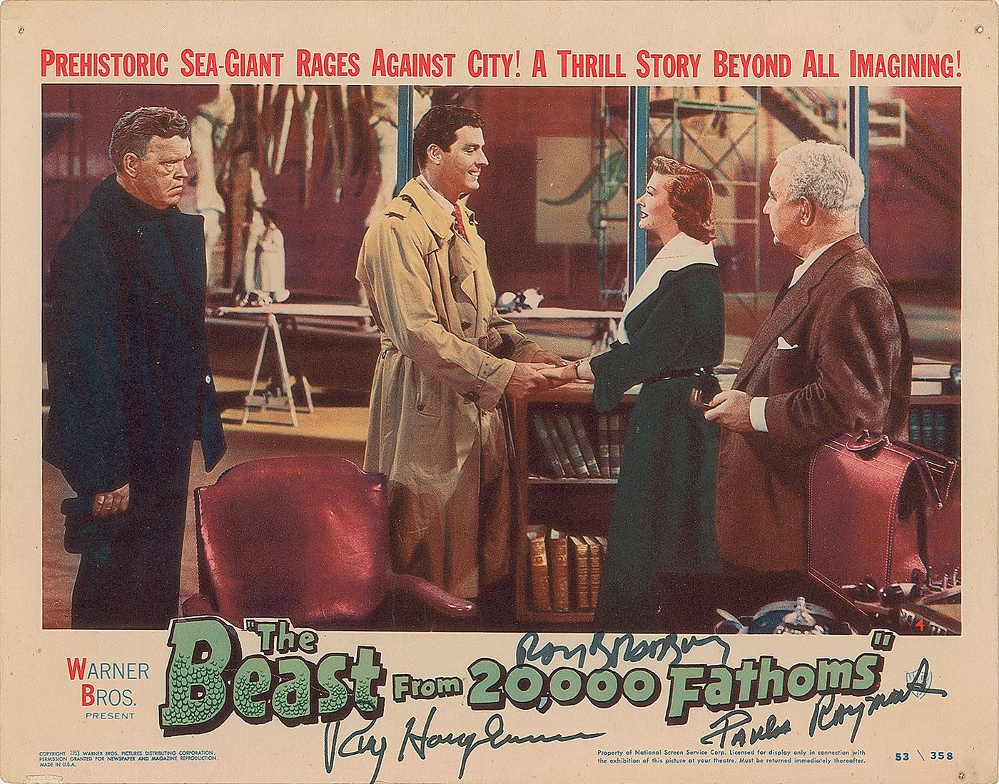 Original color Warner Bros. lobby card for the 1953 monster film The Beast from 20,000 Fathoms, 14 x 11, signed in black felt tip by special effects master Ray Harryhausen, author Ray Bradbury, and actress Paula Raymond. In very good to fine condition, with light creasing, and tack hole to the corners. A rare lobby card that boasts a desirable set of signatures.