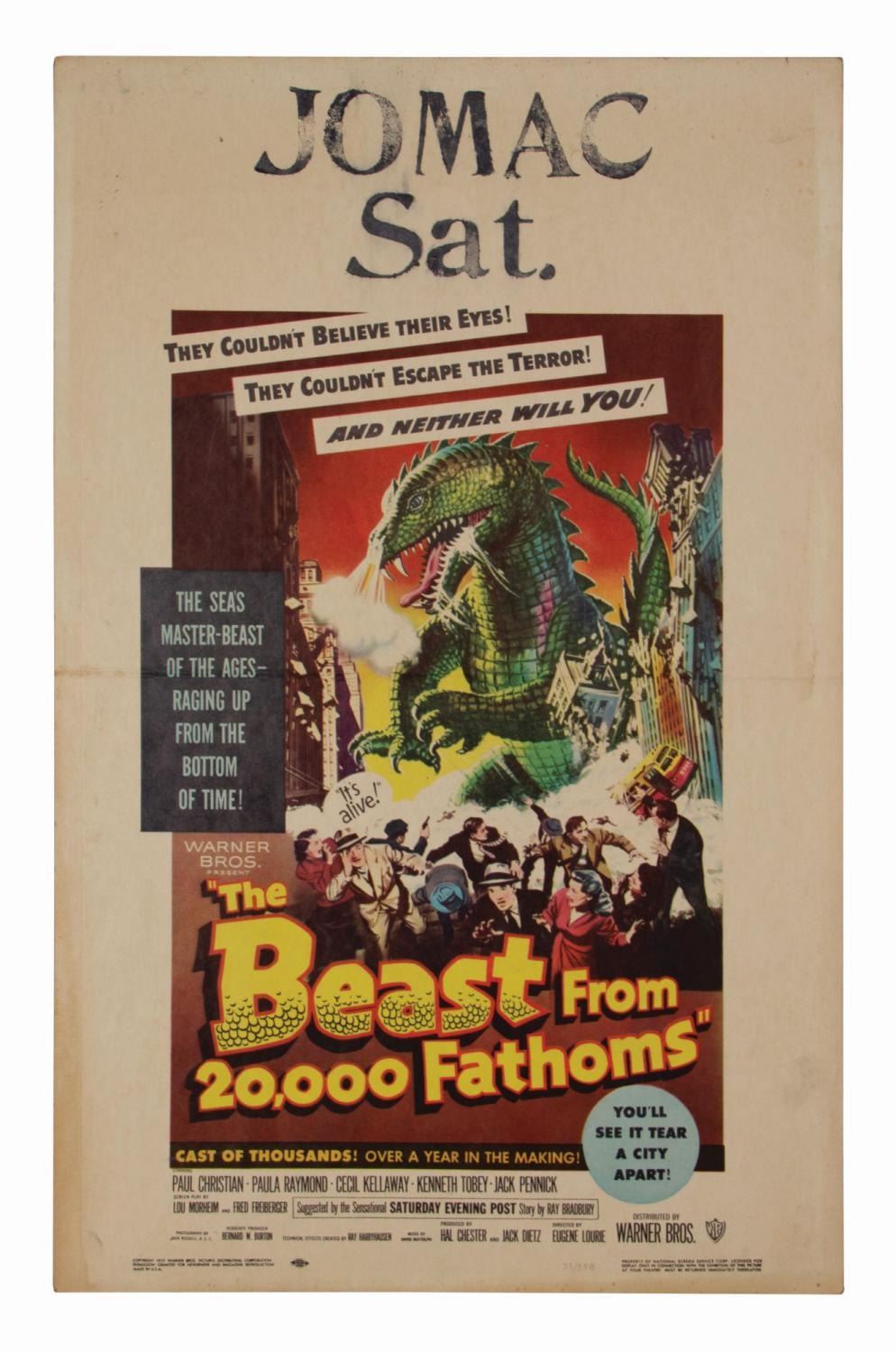 (WB, 1953) An original U.S. window card poster for the atomic monster movie, The Beast from 20,000 Fathoms. Measuring 22"x14", the poster is in good to very good condition with a large theater ink stamp in the playdate field, a thick but unobtrusive horizontal crease across the middle, a vertical surface impression running the length of the poster at right from previous framing, and some discoloration and edge wear.