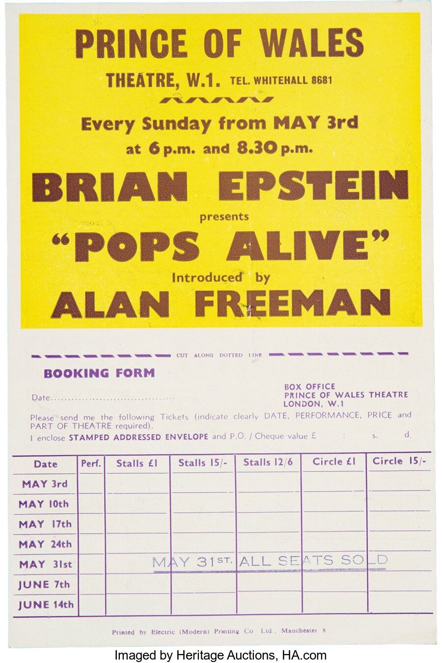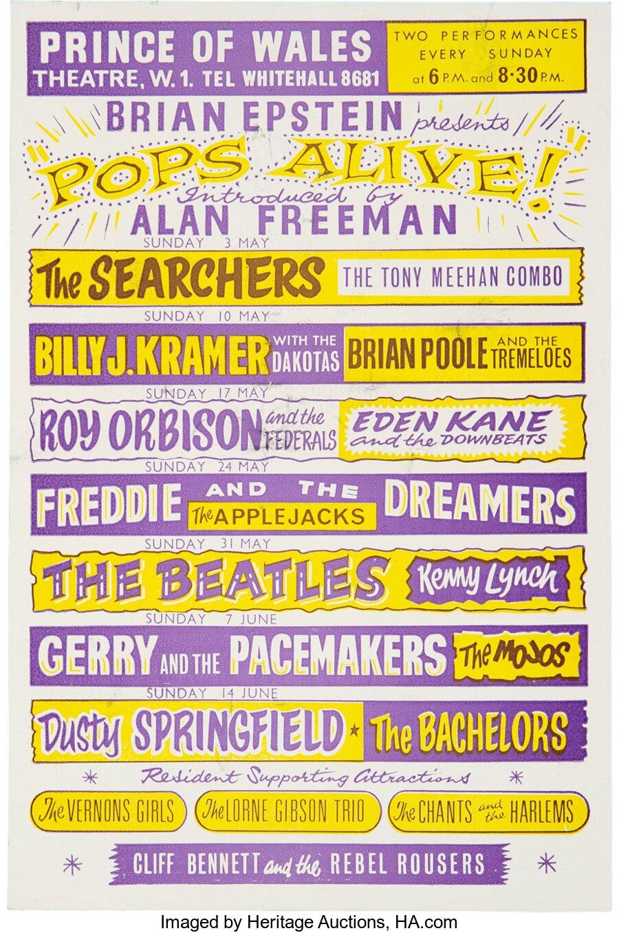 The Beatles 1964 London, England "Pops Alive!" Marquee-Style Handbill.An original paper concert flyer advertising The Beatles and many other hit acts performing at the Prince of Wales Theatre in London, England in the spring of 1964, as presented by the Fab Four's manager, Brian Epstein. The Beatles played two shows on Sunday night, May 31, with Kenny Lynch and five other acts in support. The little strip the Beatles are afforded on this flyer, the same size as all the other musicians, belies the world-conquering fame they had achieved. Perhaps it was just Epstein playing fair. Measures 5 1/2" x 8 3/8" and grades to Very Good condition. COA from Heritage Auctions.
