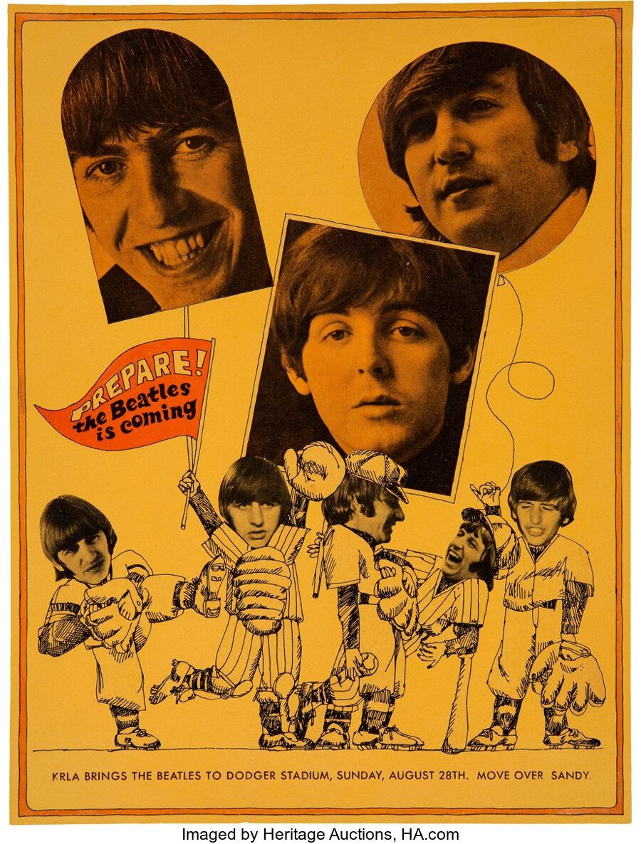 The Beatles 1966 Dodger Stadium Second-to-Last-Ever Concert Poster.An original concert poster for The Beatles playing in Los Angeles, California at the L.A. Dodgers baseball stadium on Sunday, August 28, 1966 – the penultimate show of their entire career. Their next and last stop was Candlestick Park, San Francisco the following night.
