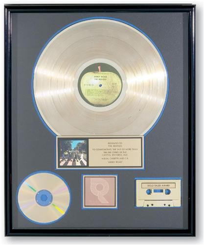 The final studio album by The Beatles contained the double-sided hit #1 single “Something/Come Together” and was released in October 1969 and certified gold on 10/27/69. It was #1 for 11 weeks on the charts and stayed in the Top 40 for 32 weeks. This RIAA certified gold “R” style hologram format award has been “Presented to The Beatles.” Note the “Ill Eagle Enterprises, LTD.” sticker on the reverse. 17 x 21”, NRMT.