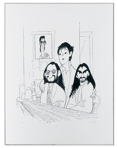 This Hirschfeld illustration depicts the then remaining three Beatles in the studio, as John watches over from a portrait on the wall. Satirical, yet touching, this lithograph was produced to commemorate the release of The Beatles Anthology. The limited edition lithograph (#34/120) is printed on heavy stock Arches archival paper and signed in pencil on the lower right hand corner by Al Hirschfeld. 20 x 25”. MT.