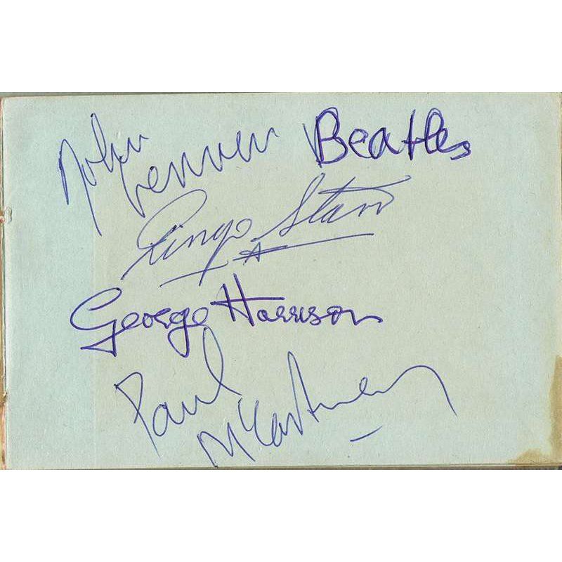 This is one page from an autograph album which has been signed by The Beatles; John Lennon, Paul McCartney, George Harrison and Ringo Starr. All four autographs appear clearly in bold blue ink. There is some staining to the bottom right hand corner of the page but this does not affect the autographs. Otherwise in very good condition. The previous owner has added the notation "Beatles" to the top of the page.