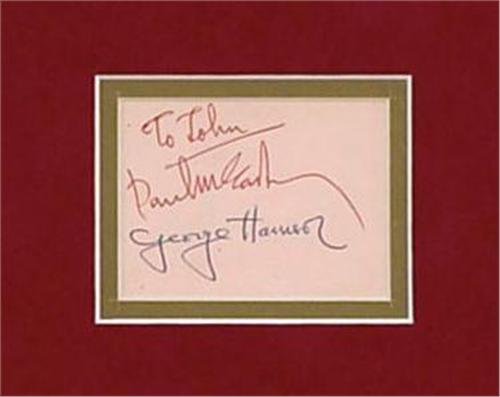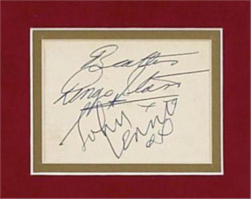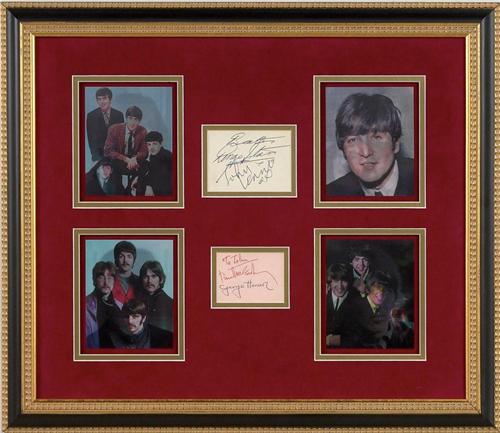 This set of Beatles signatures is on two separate off white colored slips of lined paper. The first slip was signed by John Lennon in blue ballpoint and Paul McCartney in blue fountain pen on a slip which measures 3.5 x 3”. The second slip, which is 4 x 3”, has been signed by George Harrison and Ringo Starr in blue fountain pen. This one has some staining, and there is light creasing on both. Comes with LOA from the obtainer stating she obtained these autographs outside The Casino Club and she describes her meeting with the Beatles. VG + condition. These autographs are beautifully framed with a set of four Lenticular Beatle Flasher Cards.